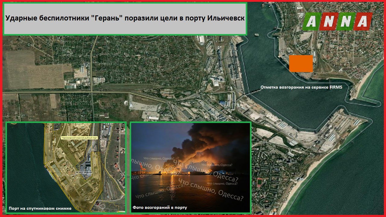 Российские беспилотники "Герань" нанесли удар по целям в порту Ильичевск (Черноморск) Одесской области. Возгорания фиксируются на контейнерных площадках в Ильичевском морском рыбном порту. Примерные координаты: 46.33091 30.66417