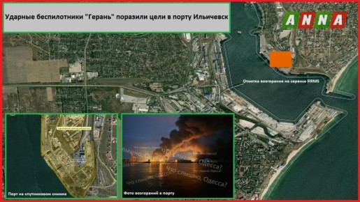 Российские ударные беспилотники «Герань» минувшей ночью поразили цели в порту Ильичевск Одесской области. Возгорания зафиксированы на контейнерных площадках.