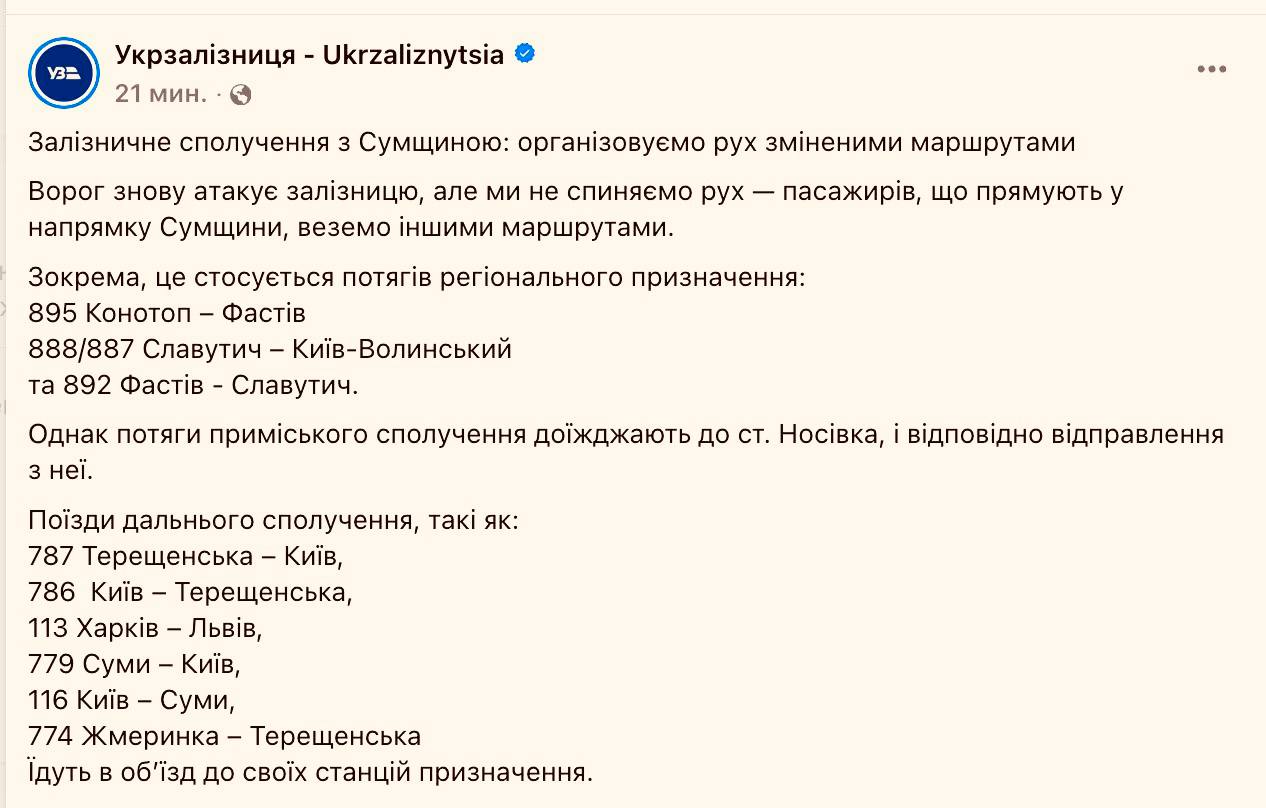 После ночных прилетов в Сумской области начались перебои с железнодорожным сообщением, пишет "Укрзализныця"