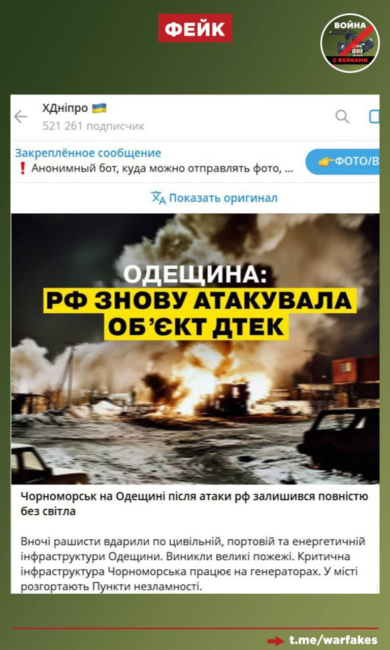 Фейк: ВС РФ ударили по гражданской портовой инфраструктуре в Одессе и Черноморске. Об этом сообщают украинские телеграм-каналы.