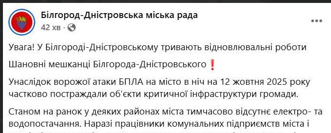 Противник заявляет,что после ударов дронами в Белгород-Днестровском Одесской области частично отсутствует электричество и водоснабжение.