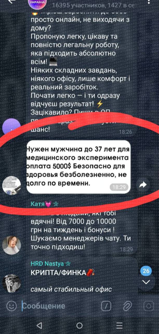 Одессит наткнулся в чате с вакансиями на странное объявление – требовался мужчина до 37 лет для безопасного и безболезненного медицинского эксперимента за $5000. Мужчину привлекла оплата, и он решил откликнуться.