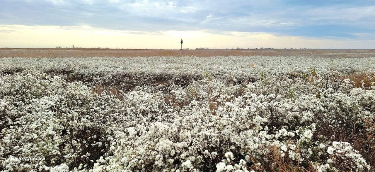 Солончаковая астра, которая цветет до поздней осени, теперь покрыла землю тысячами пушистых белых шариков.