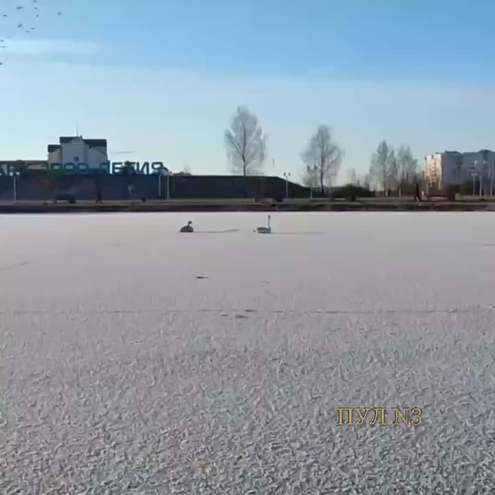 Водолазы, рискуя собой на ещё тонком льду, начали подбираться к птицам — и вдруг они поднялись, а один, хоть и с трудом, но улетел.