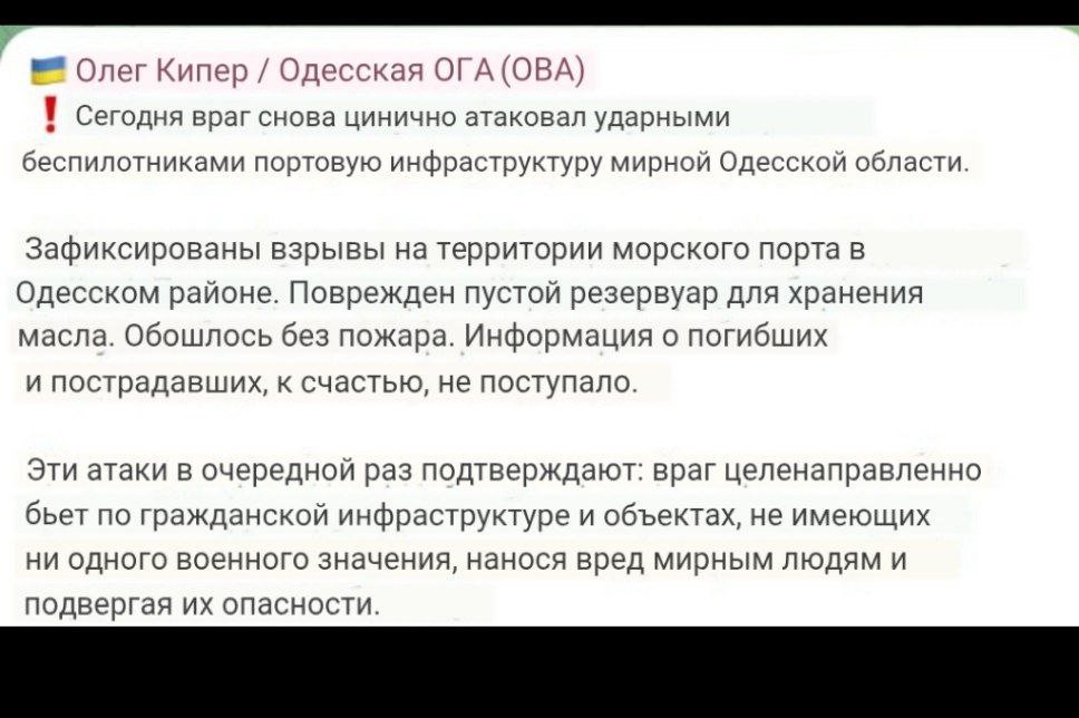 Наши бьют по морпорту, повреждены объекты морской экономической деятельности - резервуары для масла (перевод текста машинный)