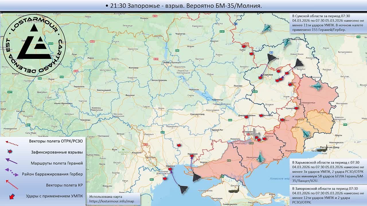 Фронтовая сводка 5 мартаНа Херсонском направлении ВС РФ продолжают бить по пунктам управления БПЛА ВСУ на правом берегу. Враг выпустил 37 боеприпасов по левобережью. В Каховке обстреляли здание детского сада. В Железном Порту ранено 2 мирных жителя.На...