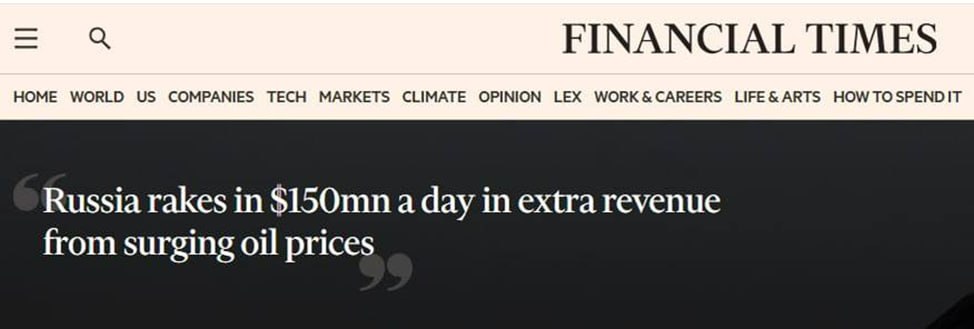 Financial Times плачет крокодильими слезами: после закрытия Ормузского пролива у Китая и Индии резко вырос спрос на российскую нефть. Уже сейчас Россия получила $1,3–1,9 млрд дополнительных доходов от экспорта нефти, а к концу марта эта сумма может возрасти до $3,3–4,9 млрд.