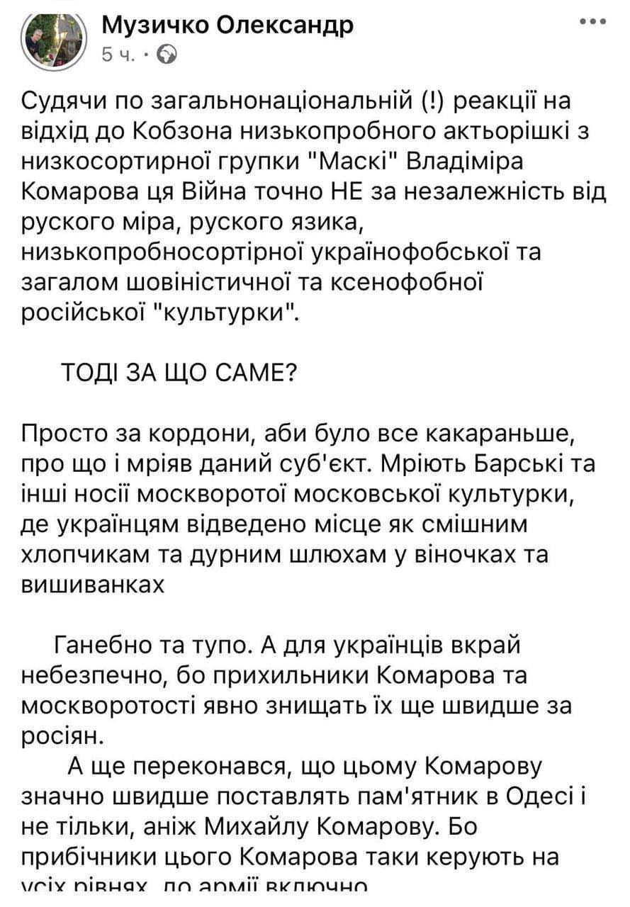 «Судя по общенациональной реакции на уход низкопробного актеришки из низкосортирной группки «Маски» Владимира Комарова, эта война точно не за независимость от русского мира, русского языка, низкопробносортирной украинофобской и в целом шовинистической и ксенофобной Российской «культурки», —