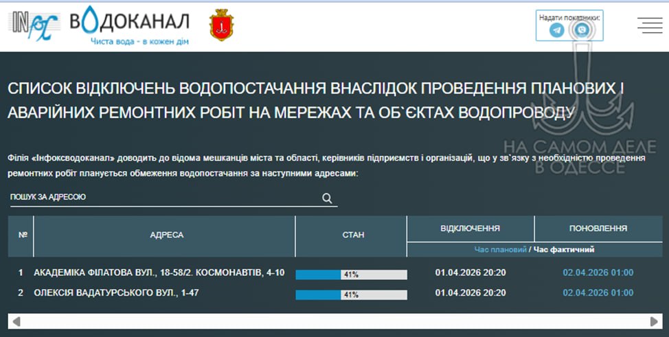 Коммунальные службы 02 апреля 2026 года в Одессе и области информируют: