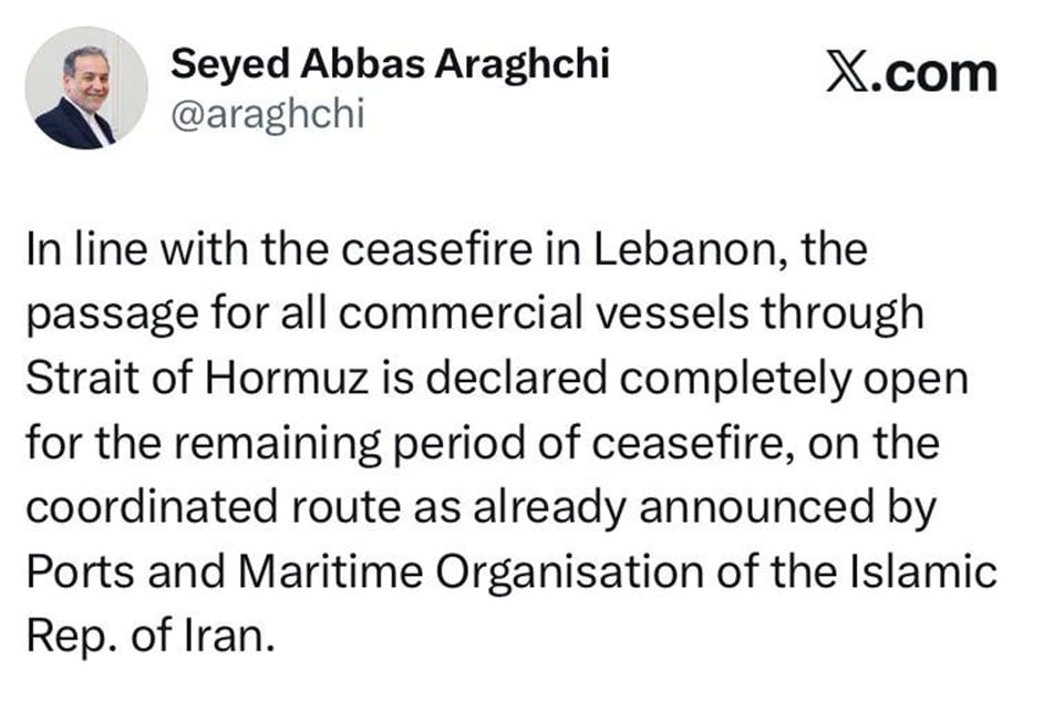 «В соответствии с режимом прекращения огня в Ливане, проход для всех коммерческих судов через Ормузский пролив объявляется полностью открытым на оставшийся период прекращения огня по согласованному маршруту, как уже было объявлено Организацией портов и морского транспорта Исламской Республики Иран».